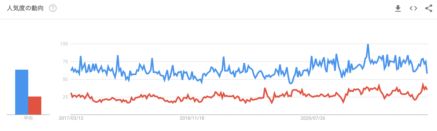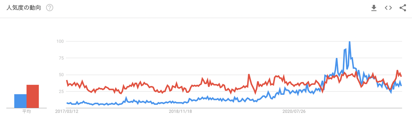 (青線がフルーツサンド、赤線がベーグル。参照元:Google Trend 2017年3月〜2022年3月)
