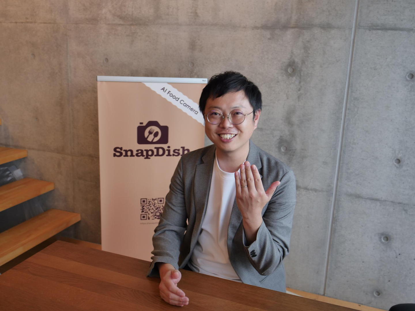 (写真:カメラマンに手を動かしてみてといわれて照れながらやってみる佐藤さん)