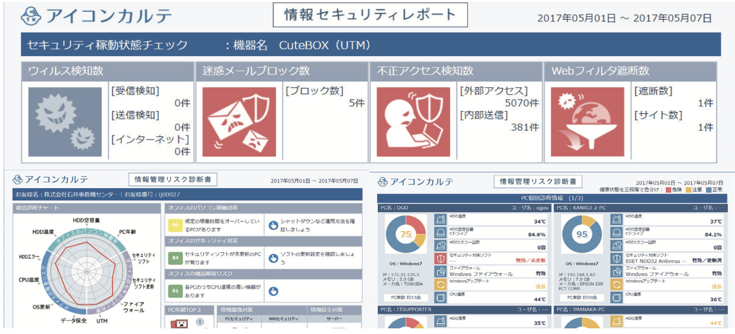 ウィルス対策、迷惑メール対策、不正侵入対策、不正WEB閲覧対策などの、複数の脅威対策を1台に集約した結合型セキュリティ機器!定期的に防御した結果をレポートで報告します。