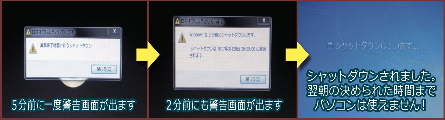 定時を過ぎても社員が帰らず、残業が横行していませんか?そんなときは、パソコンを決めた時間でシャットダウン!その時間以降の作業ができないように設定できます!