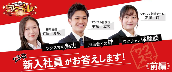 人事担当の皆様!今年の24卒採用も正念場の時期に入ってまいりました!“新卒を採用しても辞めてしまう…”“入社後の戦力化が進まない…”“そもそも内定後の辞退が発生してしまう…”そんなお悩みを持つ企業様、ぜひワクスマのストーリーをご一読ください!採用のヒントがあるかもしれません♫『圧倒的に突き抜けた学生を採用できる、ワクスマのリアルな選考「ワクチャレ」とは?《後編》』ぜひご覧ください!Q.3rdステージとはどのようなものでしたか?定岡:ワクチャレの3rdステージ(最終選考)は、なんと2週間もかけて行います。最後の課題は、“自分が人生で成し遂げたいビジョンとテーマ”の発表なので、この2週間、発...
