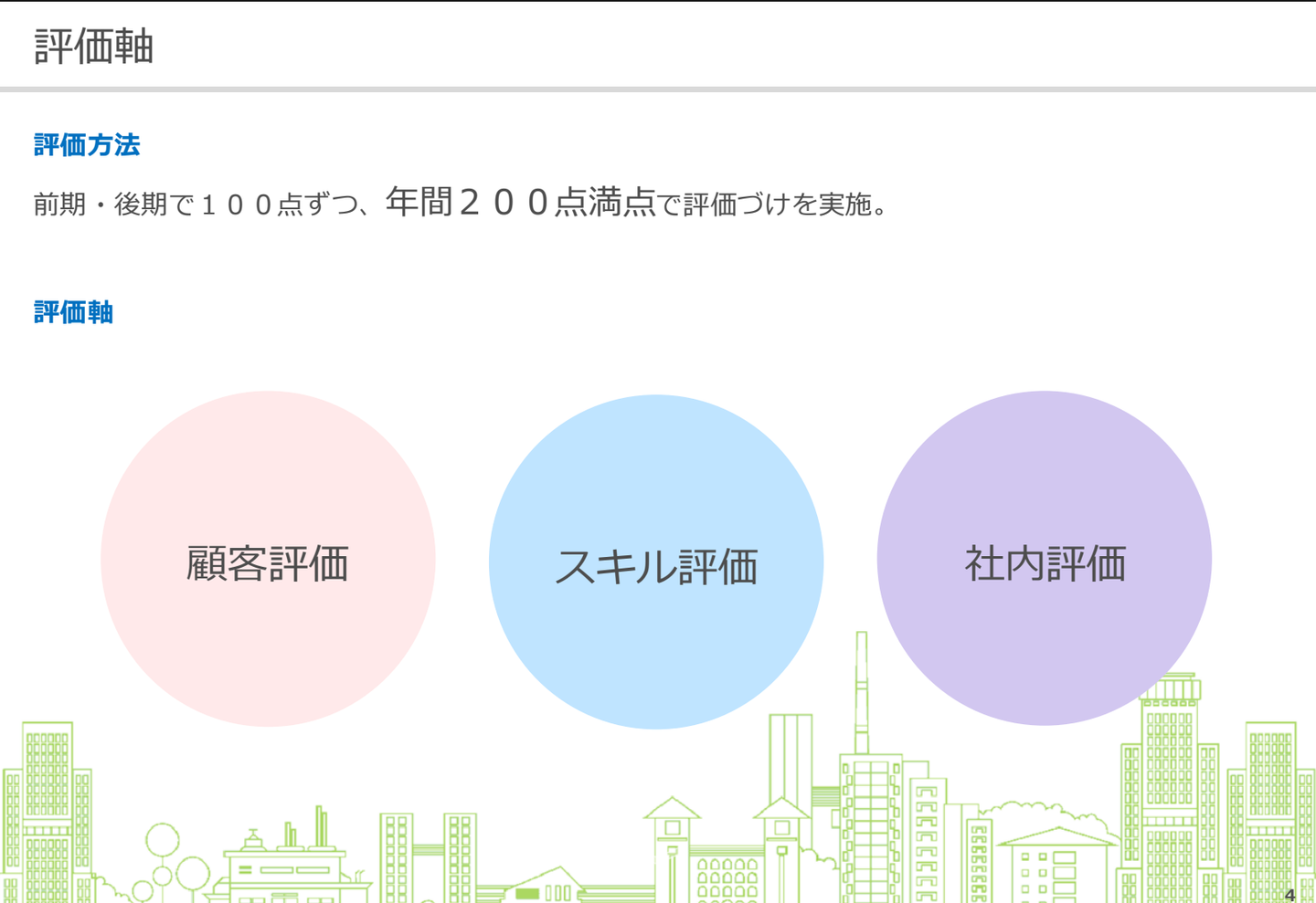 評価方法としては、半年で100点、年間200点満点で評価付けをしており、