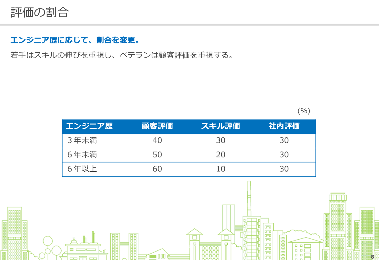 ワクトでは、顧客評価とスキル評価の割合を、エンジニア歴に応じて調整しています。
