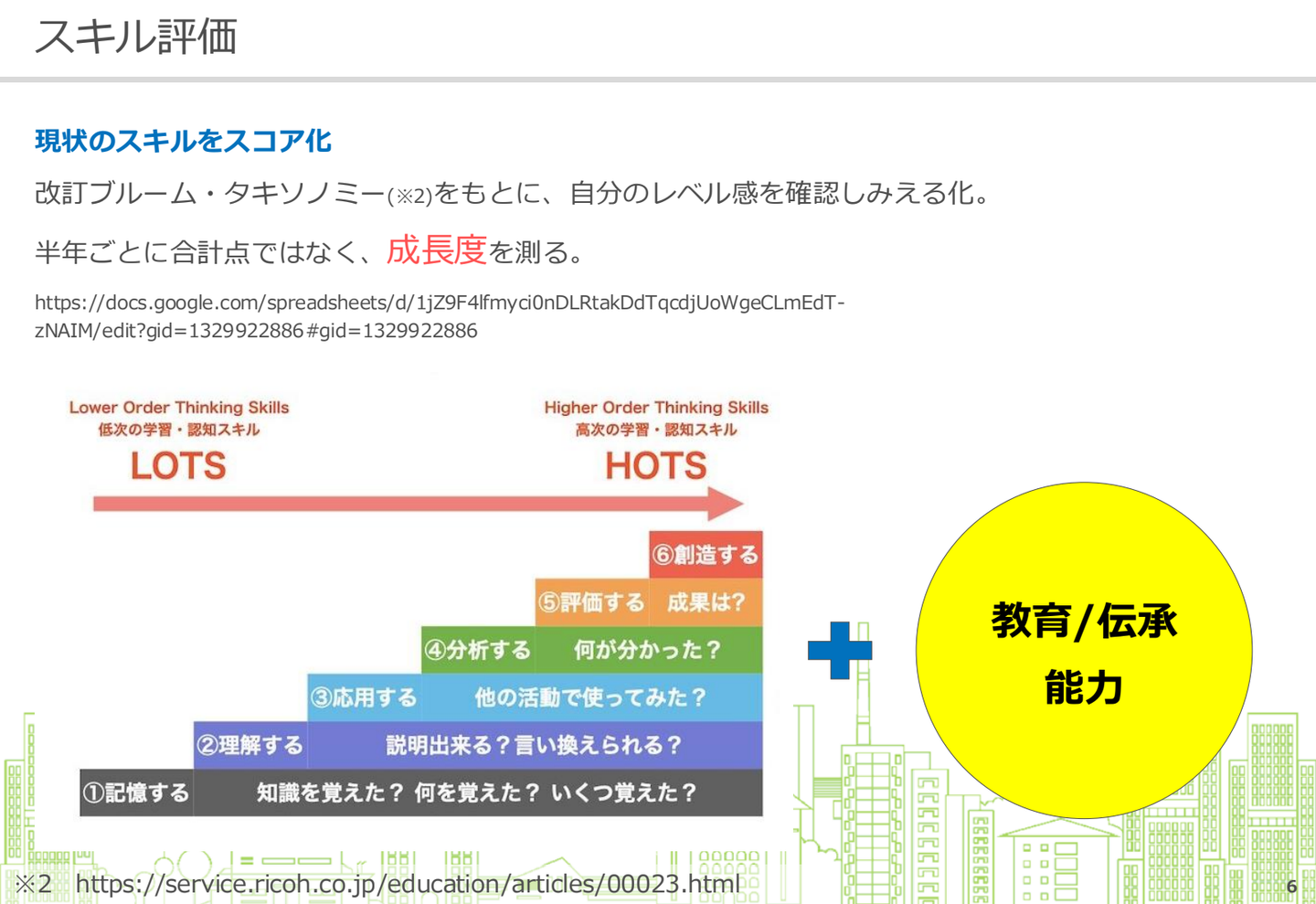 スキル評価では予め半年後の目標設定を行い、その成長度合いが評価ポイントとなっていきます。ベースにしているのは、ブルーム・タキソノミーという教育理論。