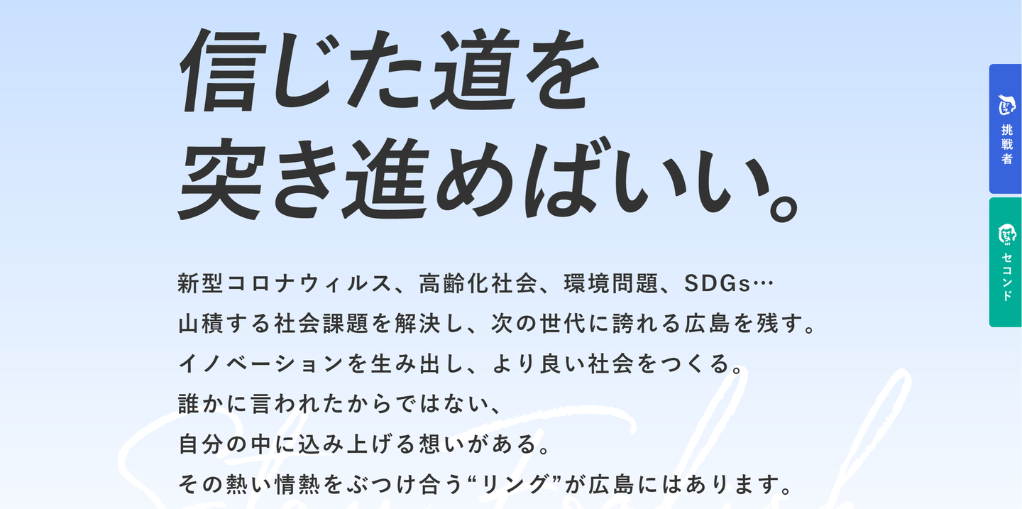 その名も「RING HIROSHIMA 2ndBout!(リンク先は今年度のHP)」「イノベーション立県」を掲げた広島県が本気で社会課題を解決したい!!この想いを実現するために実施しているプロジェクトが「RING HIROSHIMA 2ndBout!」である!