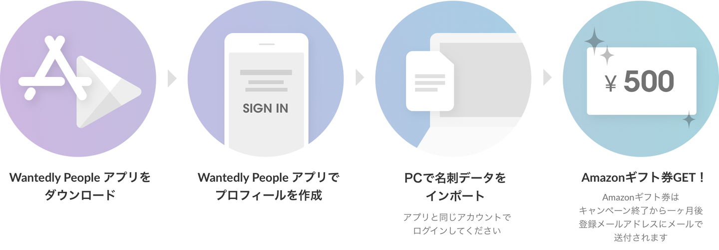期間中に、名刺管理アプリ「Wantedly People」にログイン後、パソコン上で他サービスから名刺データを30枚以上インポートすると、もれなくAmazonギフト券500円分をプレゼント!