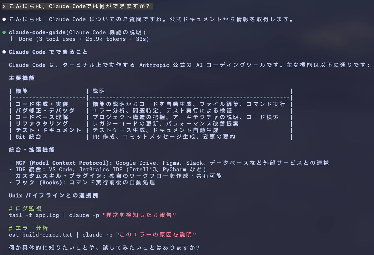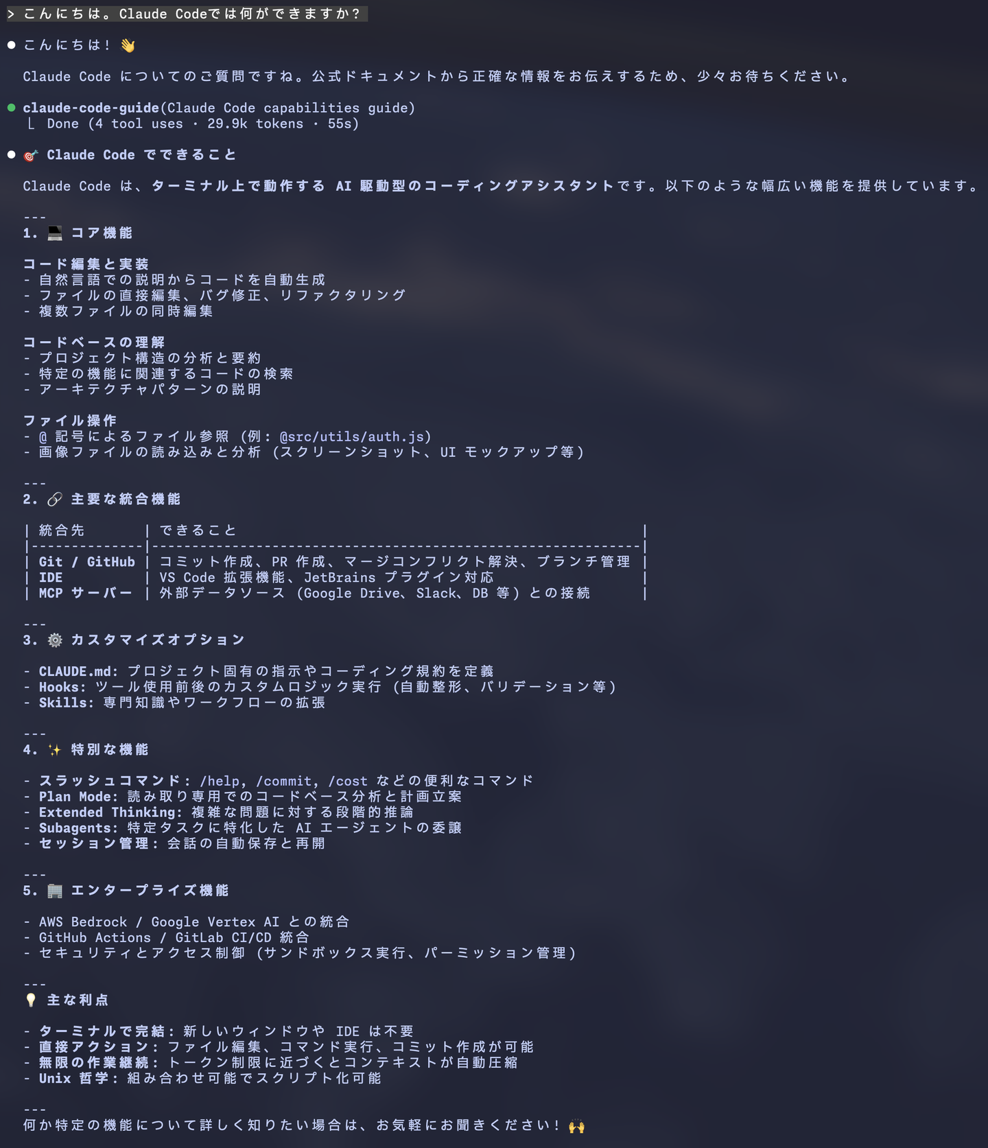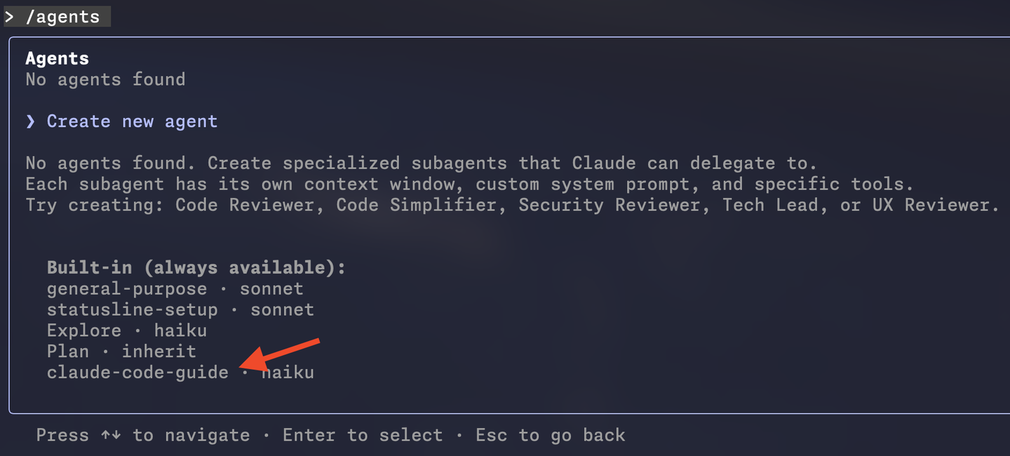 新たに Subagents / Agent Skills / Custom Slash commands を作成したいと思った際には基本的に自分で書かないようにしています。これは、 Claude Code のベストプラクティスは Claude Code 自身が知っているからです。Claude Code には claude-code-guide という組込みの Subagents が存在します。
