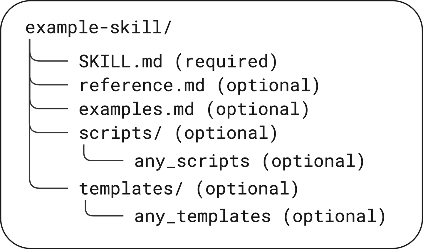 }Agent Skills は Claude Code に再利用可能な専門知識を提供する仕組みです。標準的なAgent Skills の構成は以下の通りです。