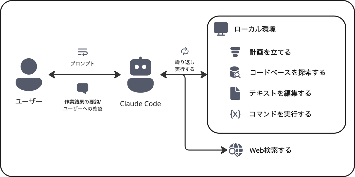 Agentic に動作するために「作業計画を立て」、「コードーベースを探索 (必要であれば Web を検索) 」し、ローカルに存在する「テキストファイルを編集する」ことをユーザーの「プロンプト」に基づいて「繰り返し実行」しています。