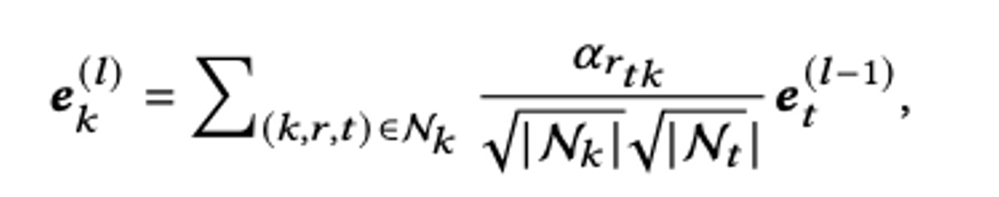 概要としては、LightGCNをベースにしつつ拡張しているように思われます。LightKGではLightGCNをベースとして下記の式で表されるGNN層を有しています。