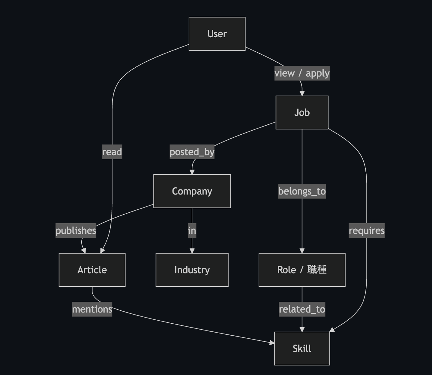 例として上記では企業とユーザーの採用現場におけるデータの関係性を表現しています。 User や Job がEntity、 read や view / apply がRelationを表しています。このようにデータとその関係性をグラフ構造を用いて管理することで、つながりを辿って関連する情報へアクセス・利用することができるようになります。