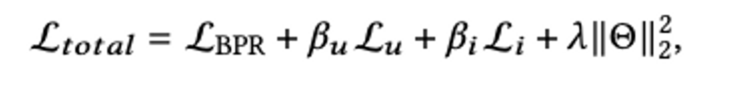 Lossについては、BPR Lossと userとitemそれぞれの0層目の埋め込みを用いた対照学習のLoss、正則化項を組み合わせた下記のようなLossを利用しています。