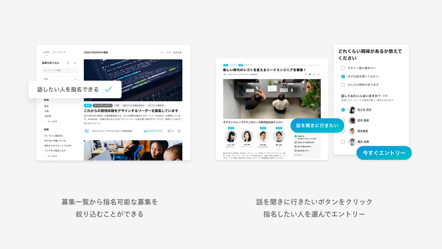 今回Wantedlyにおいて、カジュアル面談の申込時に候補者が「話したい相手」を指名できる機能を提供します。これにより、候補者と企業との間に起こりうるミスマッチを防ぎ、カジュアル面談の質をさらに高めることを目指します。