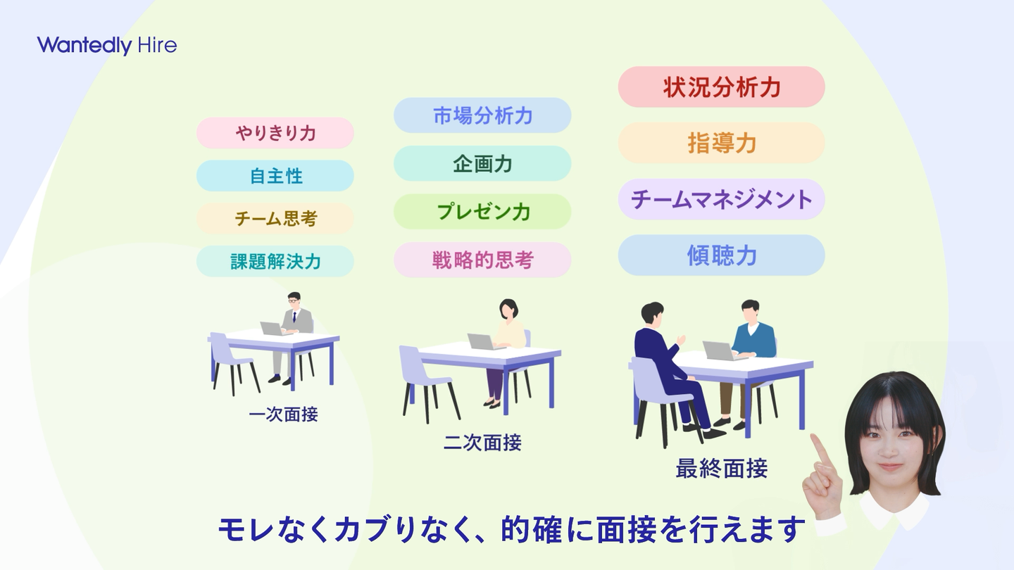 Wantedly Hireの大きな特徴の一つに、誰しもが統一された判断基準で候補者を見極められる「構造化面接」を可能にすることがあります。