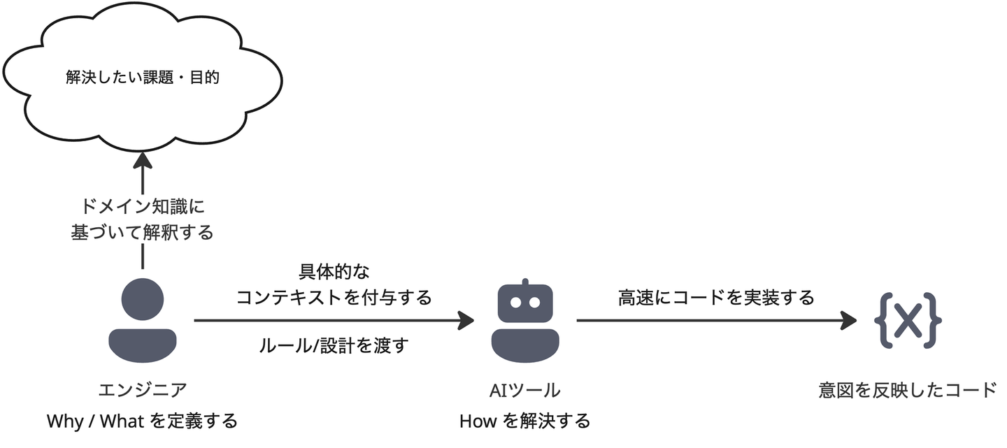 AIツールは「この処理を書いてほしい」という手段 (How) の解決においては優れたパフォーマンスを発揮します。しかし、実務のプロダクト開発において、システム全体の設計意図や厳密なビジネス要件をAIが自発的に汲み取るわけではありません。私自身、このギャップに直面し試行錯誤することがこれまで何度もありました。