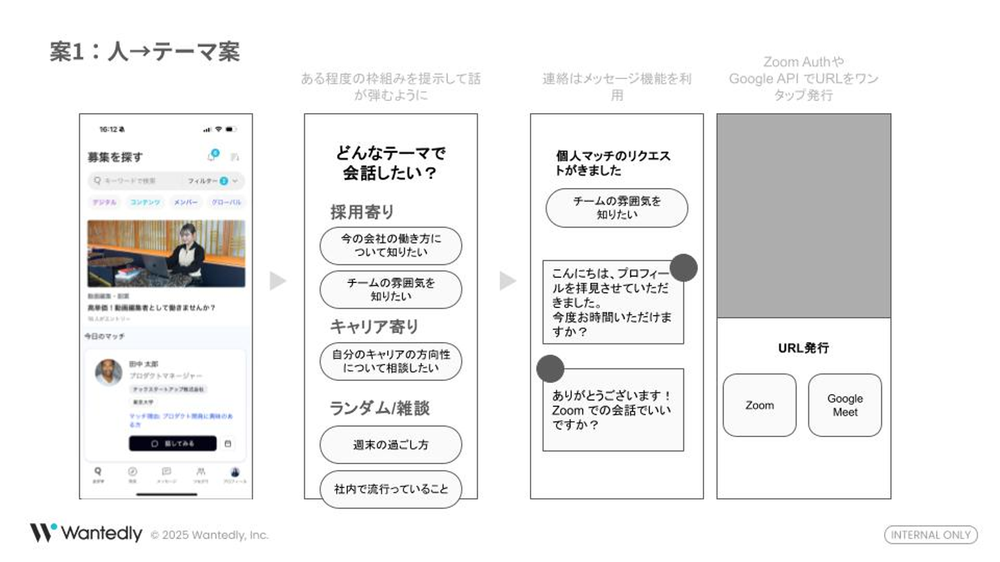 Wantedlyでは一貫して、スペックや条件面だけでなく、ストーリーや募集記事といった発信を通して、会社の想いやメンバーの人柄そのものが伝わることを大切にしてきました。一方で、そうした魅力を文章で継続的に発信するのが難しい企業もある。であれば、個人同士をつなぐことで、ライティングに頼らなくても、「誰と話せるか」そのものや、人や面談自体をコンテンツとして届けられるのではないかと考えました。そのうえで、「誰が誰と話したいのか」という議論から始まり、その結果「候補者が話したい相手を指名できる」といった形で、方向性が固まっていきました。