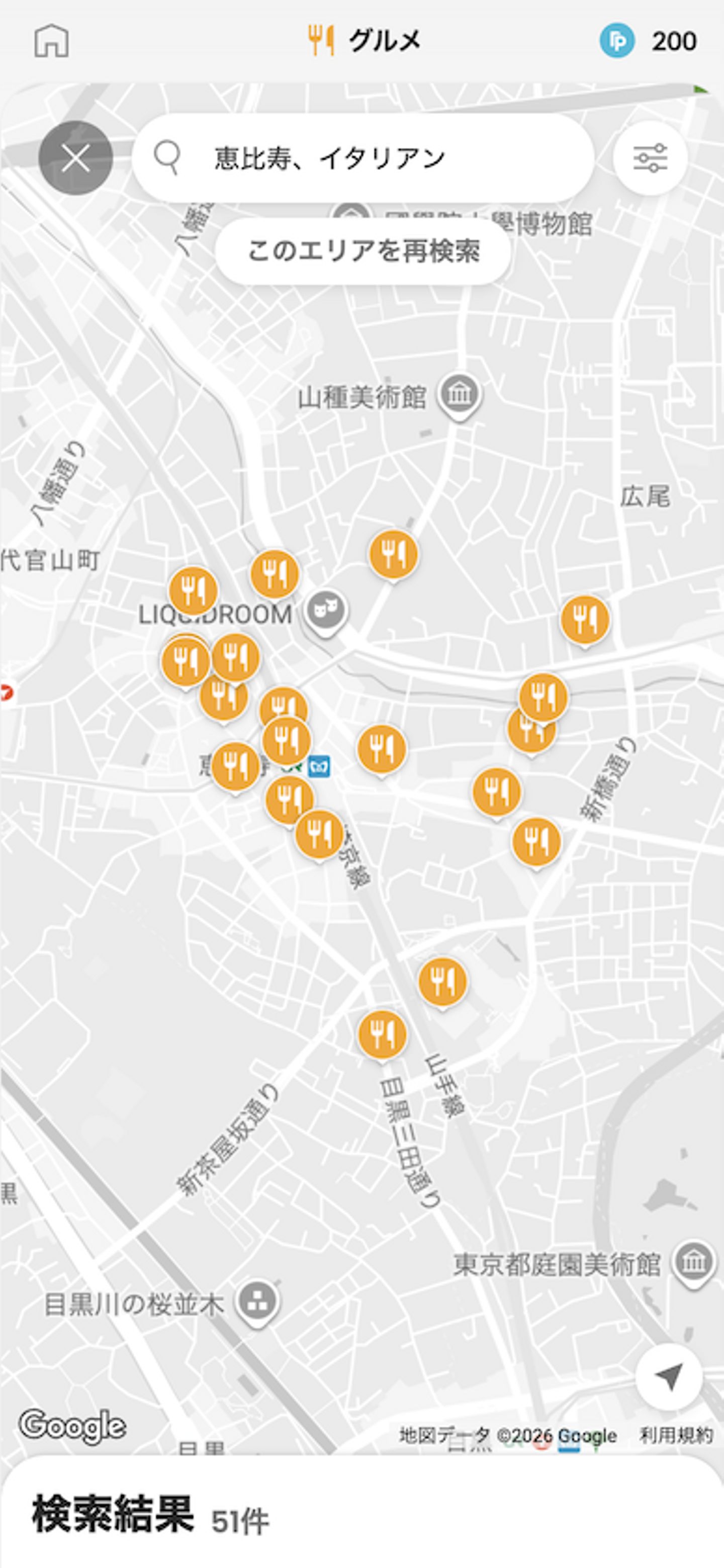 - ピンが重なる: 同じビルに複数の飲食店が密集しているエリアでは、店舗のマーカー同士が重なってタップできなくなる