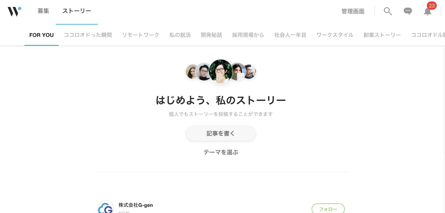 ストーリータブ上部の「記事を書く」ボタンから、個人としてストーリーを投稿できます。