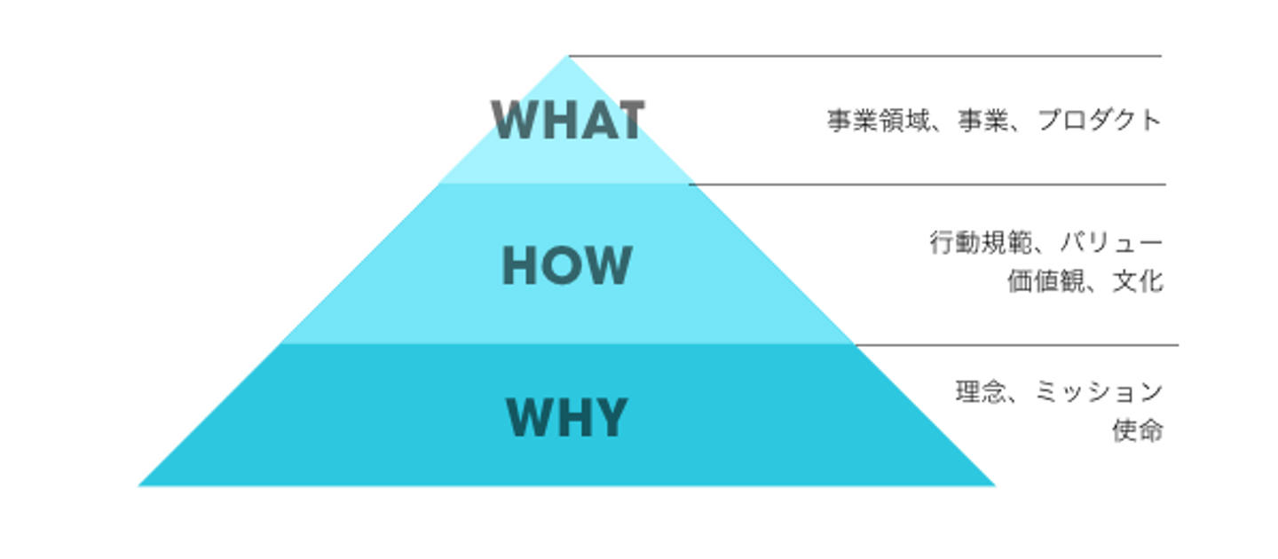 これら、WHYやHOWは非常に大事ですが、一番疎かになりがちな領域です。まだ社員が10名ほどで、理念という以前にプロダクトが生きるか死ぬかという時には不要ですが、社員規模が30名を超えてきたり、採用を強化して知り合いづて以外で採っていくとなると、WHYとHOWを言語化し、それらを採用基準に設定することが必要です。