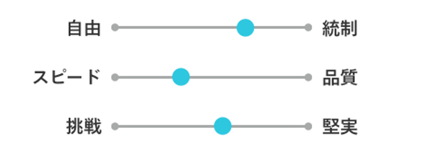 これらはあくまで事例なので、自社で二項対立を考え、一つの極に対してうちの会社はこちら側、というのを決めるとよいかと思います。