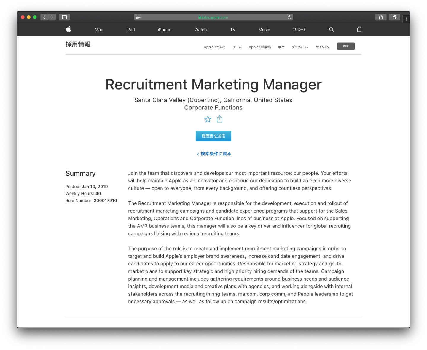 まず前提として、「リクルートメントマーケター」という職業は、採用先進国アメリカにおいては当たり前のものになっています。これは今年の1月にAppleの採用ページに掲載されていた募集ですが、「リクルートメント・マーケティング・マネージャー」を募集しています。