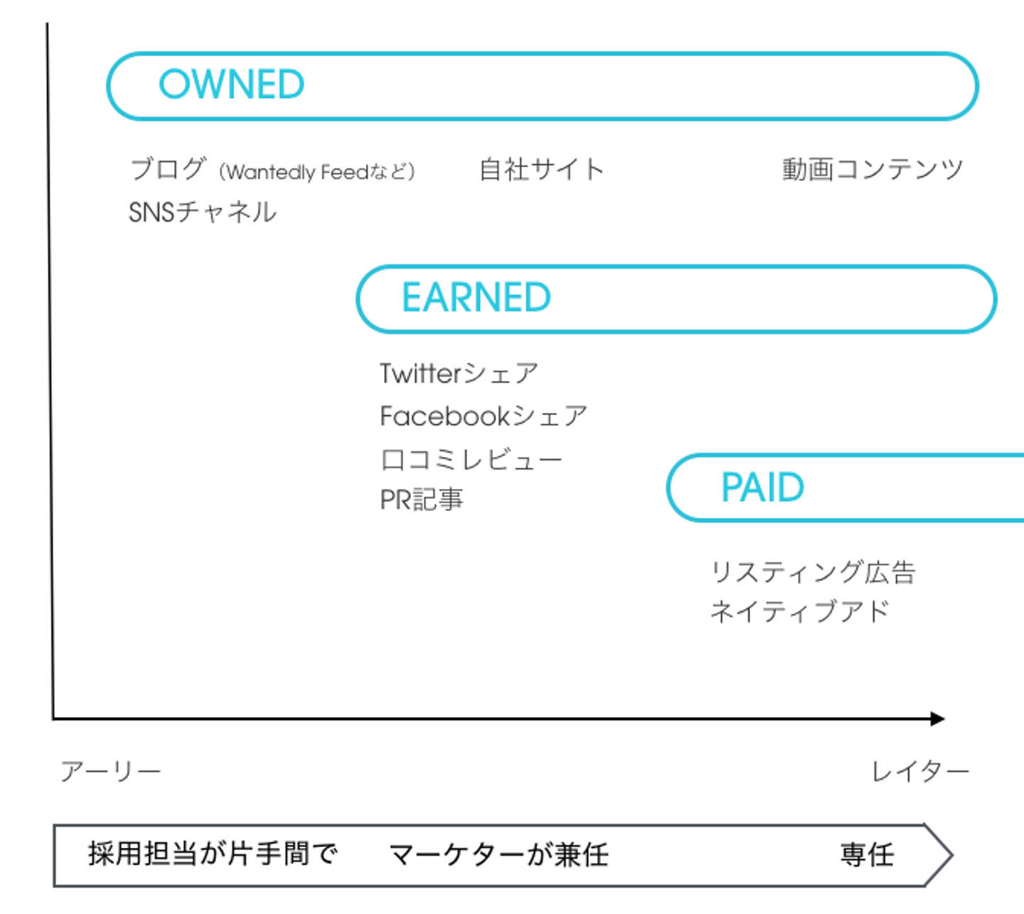 会社のプロダクトが軌道に乗ってモデルができたら、初期は採用担当が片手間で実施し(採用担当がマーケティングを会得)、採用強化フェーズになった段階で専任のメンバーを採用チームに持つ(マーケターがリクルートメントマーケターに転身)のが良いでしょう。