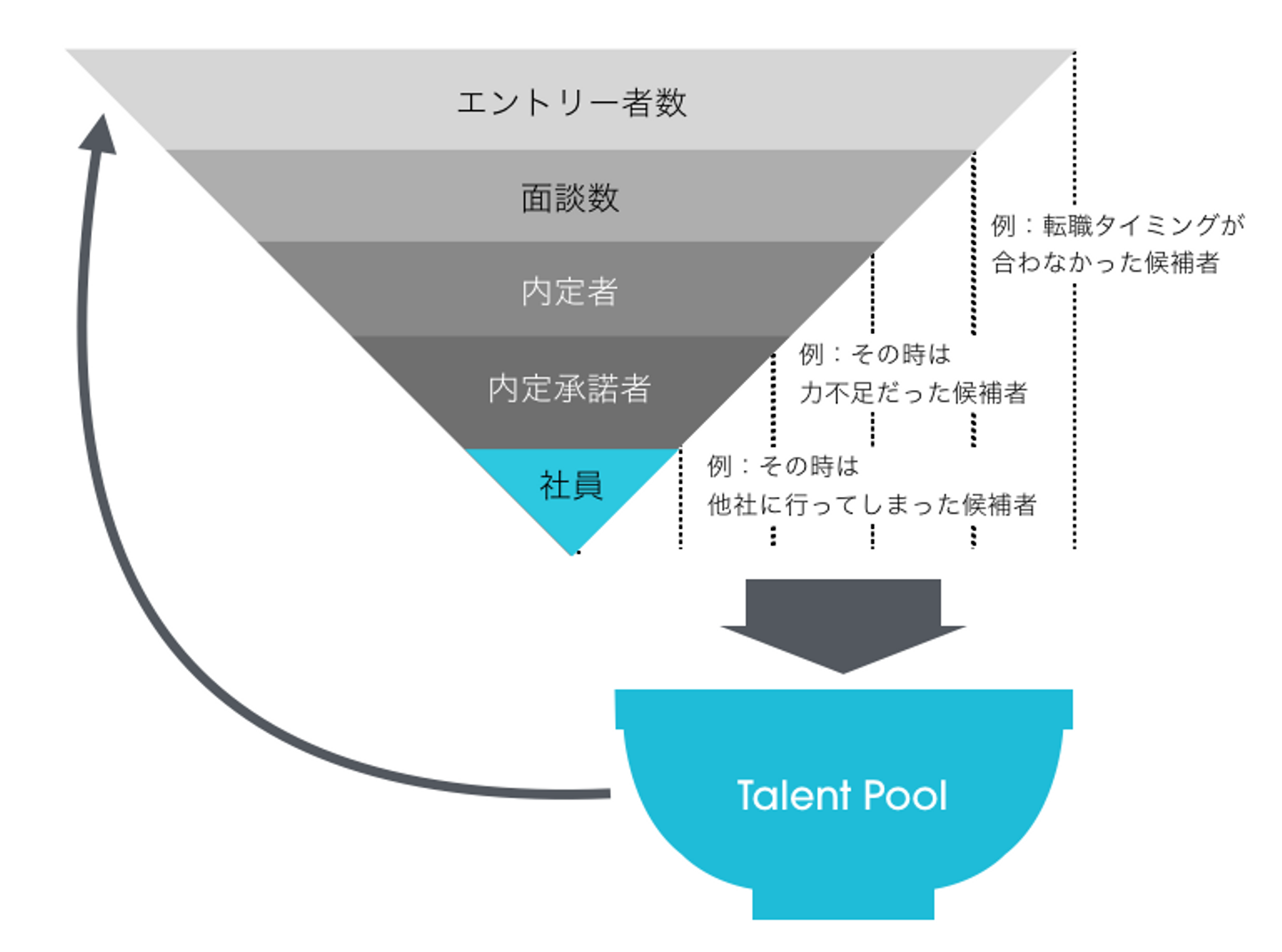 最後の「タレントプール」ですが、「タレント( Talent) = 候補者」の「プール(Pool)= 貯める」とります。これまでのように、母集団形成して、そこからフィルタリングをし、こぼれてしまった人はそのままリリースするのではなく、プールしていき、ナーチャリングの対象にしたり、タイミングがあうタイミングで再度アプローチをする方法論のことを指します。