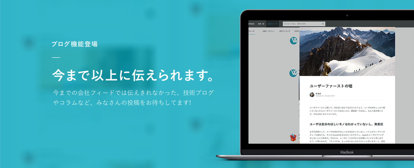 今年1月にリニューアルされてから、さらに盛り上がりを見せている会社フィードに、表現力豊かな文章を投稿できる「ブログ」機能がリリースされました。