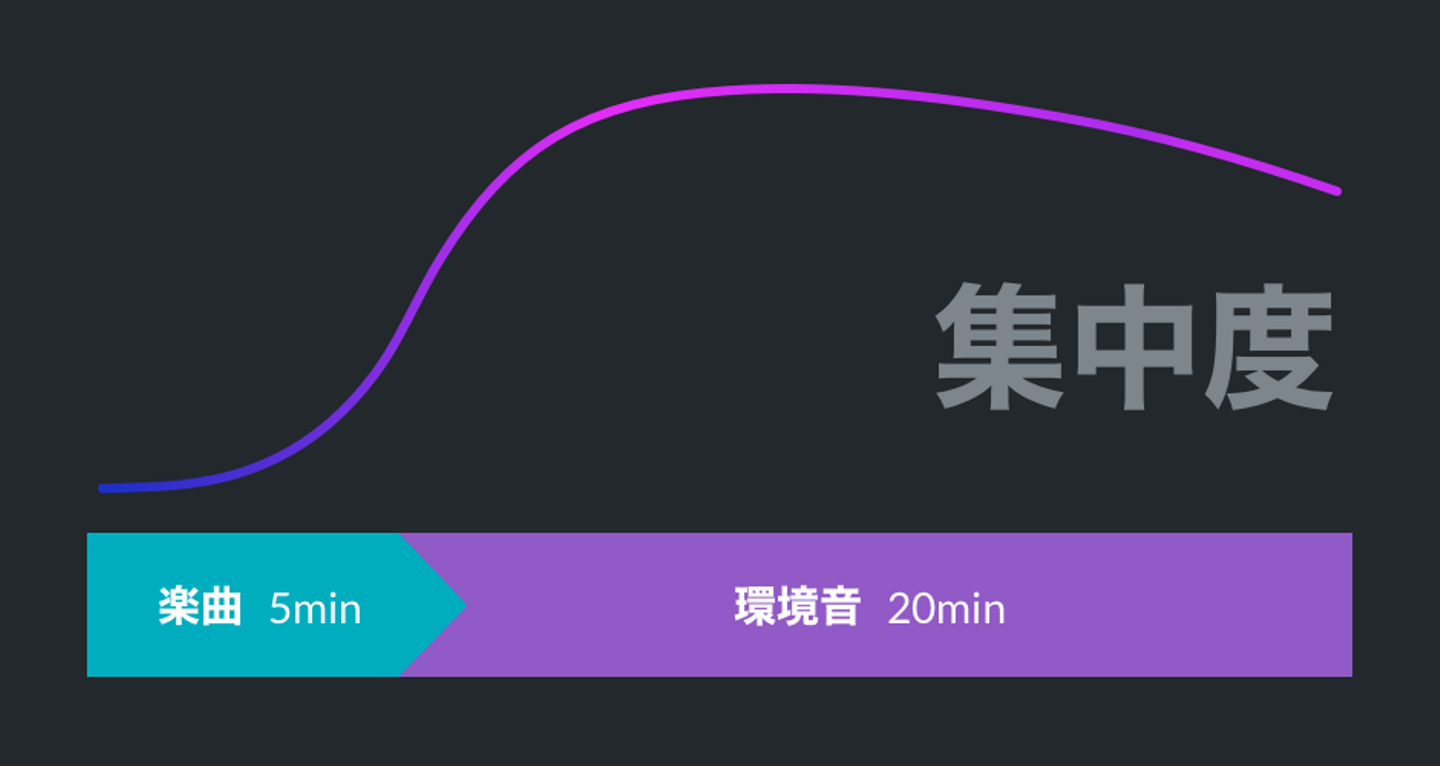 高まった集中を邪魔せず継続するには、自然の「環境音」が有効。自 然界には「1/f ゆらぎ」と呼ばれるリズムがあり、これを聴くことで リラックス効果が得られ、深い集中に向かうことが期待される。