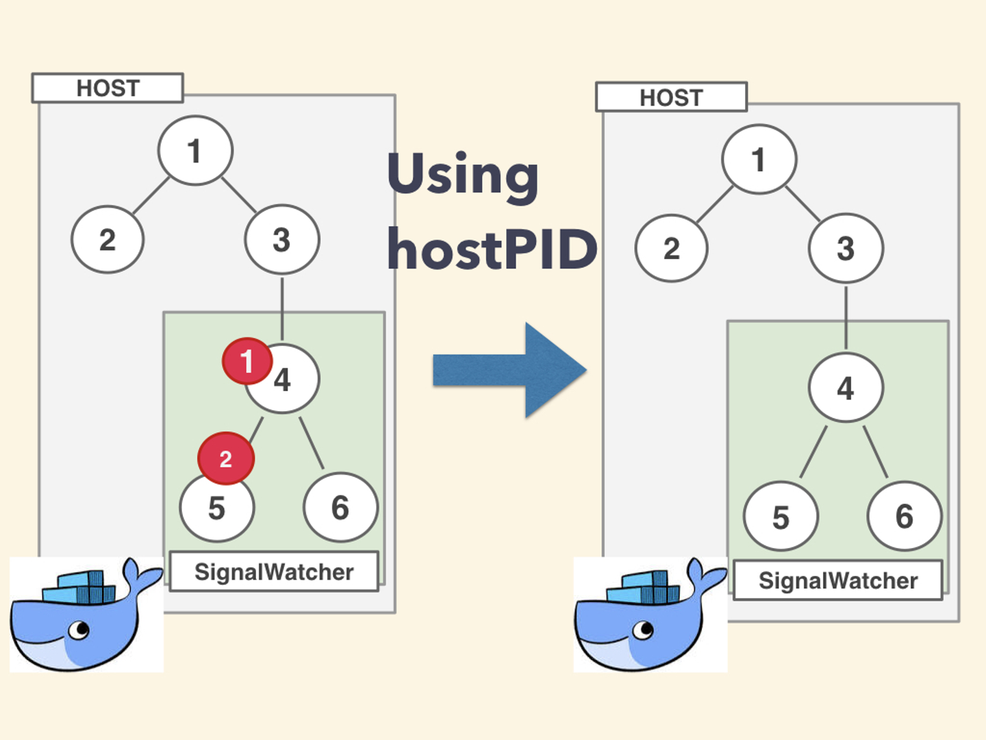 まずは、階層的仮想化のうち PID に対する仮装化が行われています。よって SignalWatcher の PID名前空間 を host 側に寄せる必要があります。
