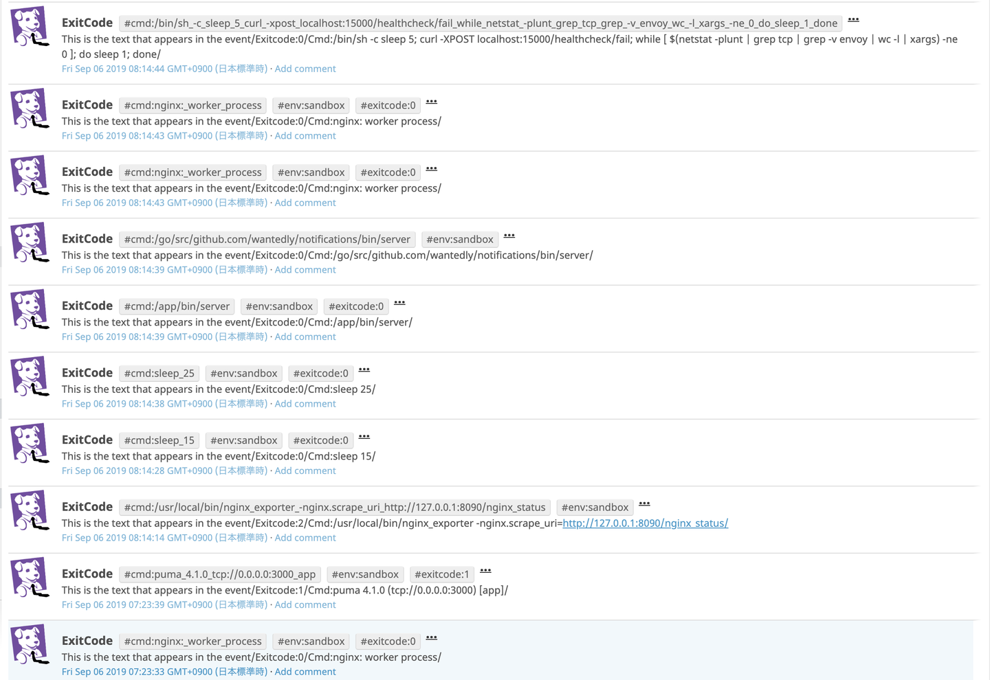 今回は直接 DatadogAPI を使って情報を送ることにしました。具体的には SIGNAL と ExitCode を Event と Metric として送ることをしました。