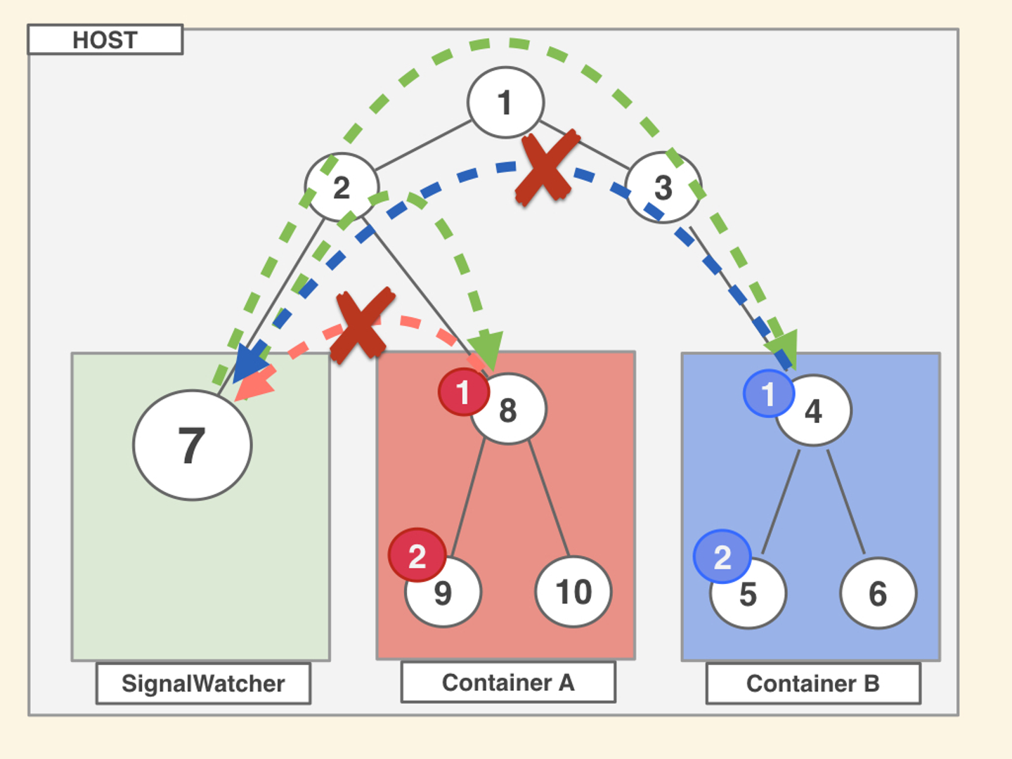 〜〜〜これを行った時のアクセスレベルとしては以下の画像のようなイメージになります。 SignalWatcher 側からアクセスできますが、他の Container内プロセス からアクセスができません。