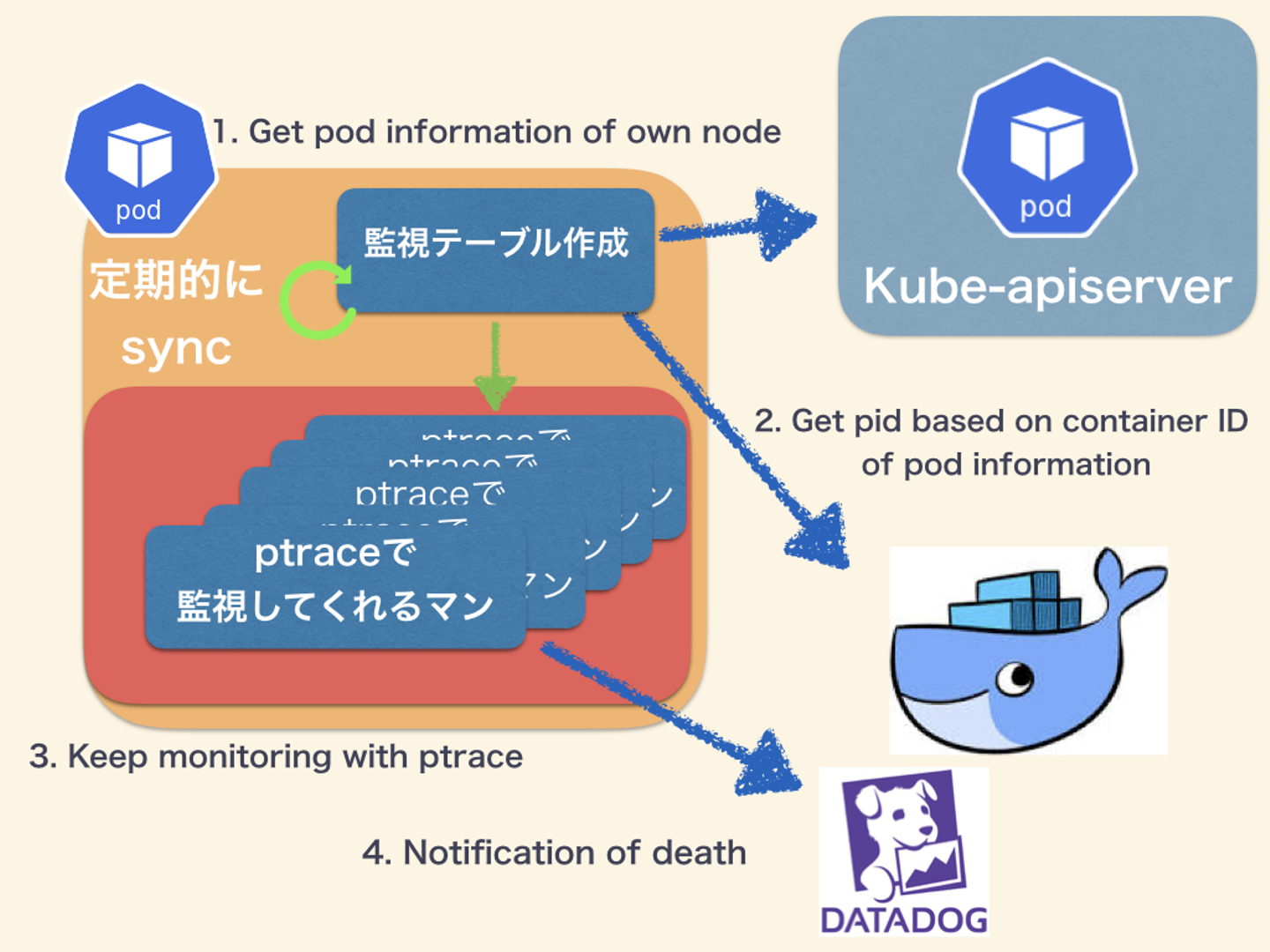 さて、以上の方法を経て、監視をするための情報を集めることができました。これらは内部でmapテーブルとして持っており、定期的に、1,2を行ってsyncをしています。