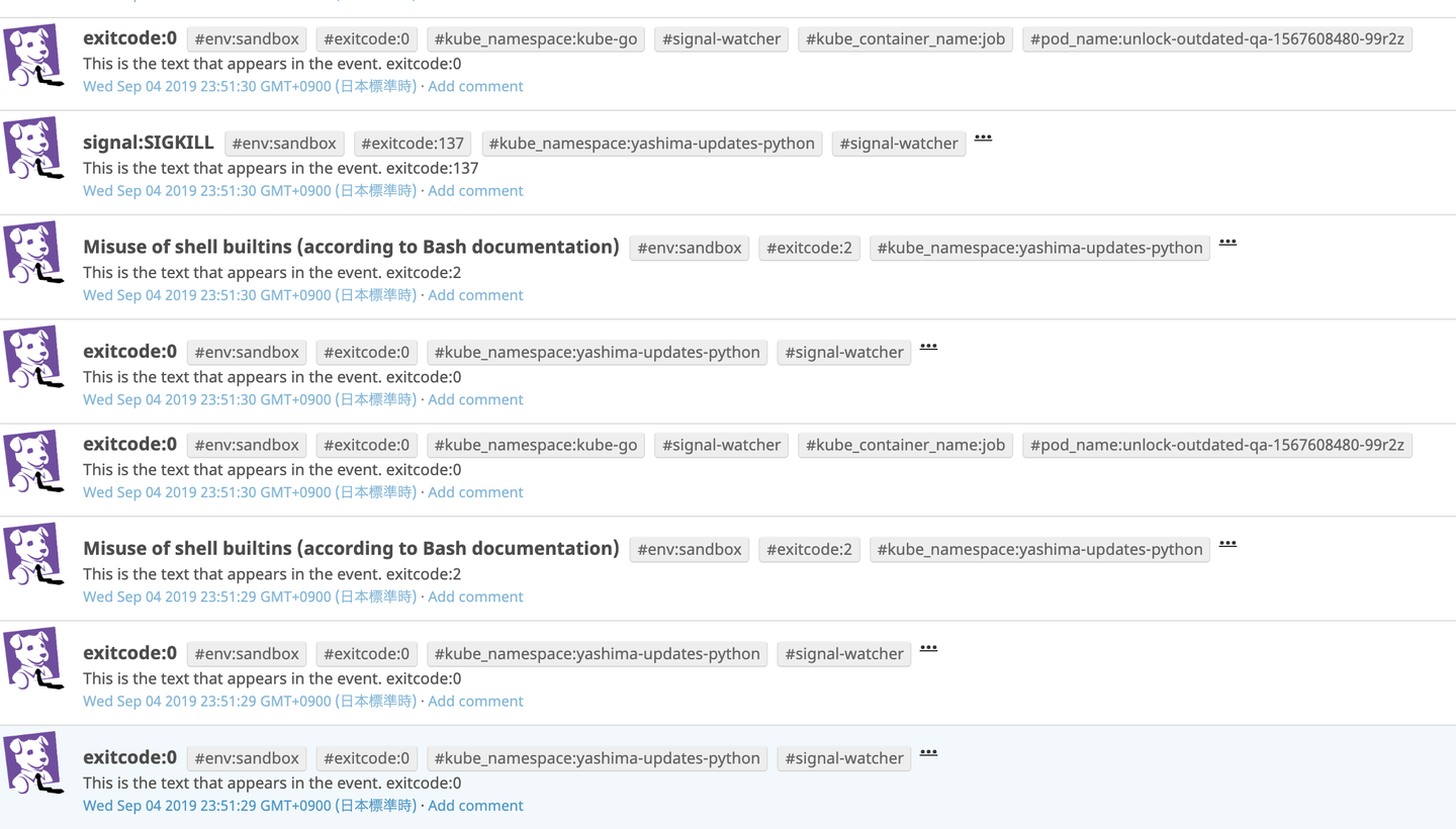 最終的な成果としてKubernetes クラスタ上で動くContainer仮想化された全てのアプリケーションのSIGNALをキャッチし、それをDatadogにEventとMetricとして送信するリアルタイムに検知を行う監視デーモンを自作しました。