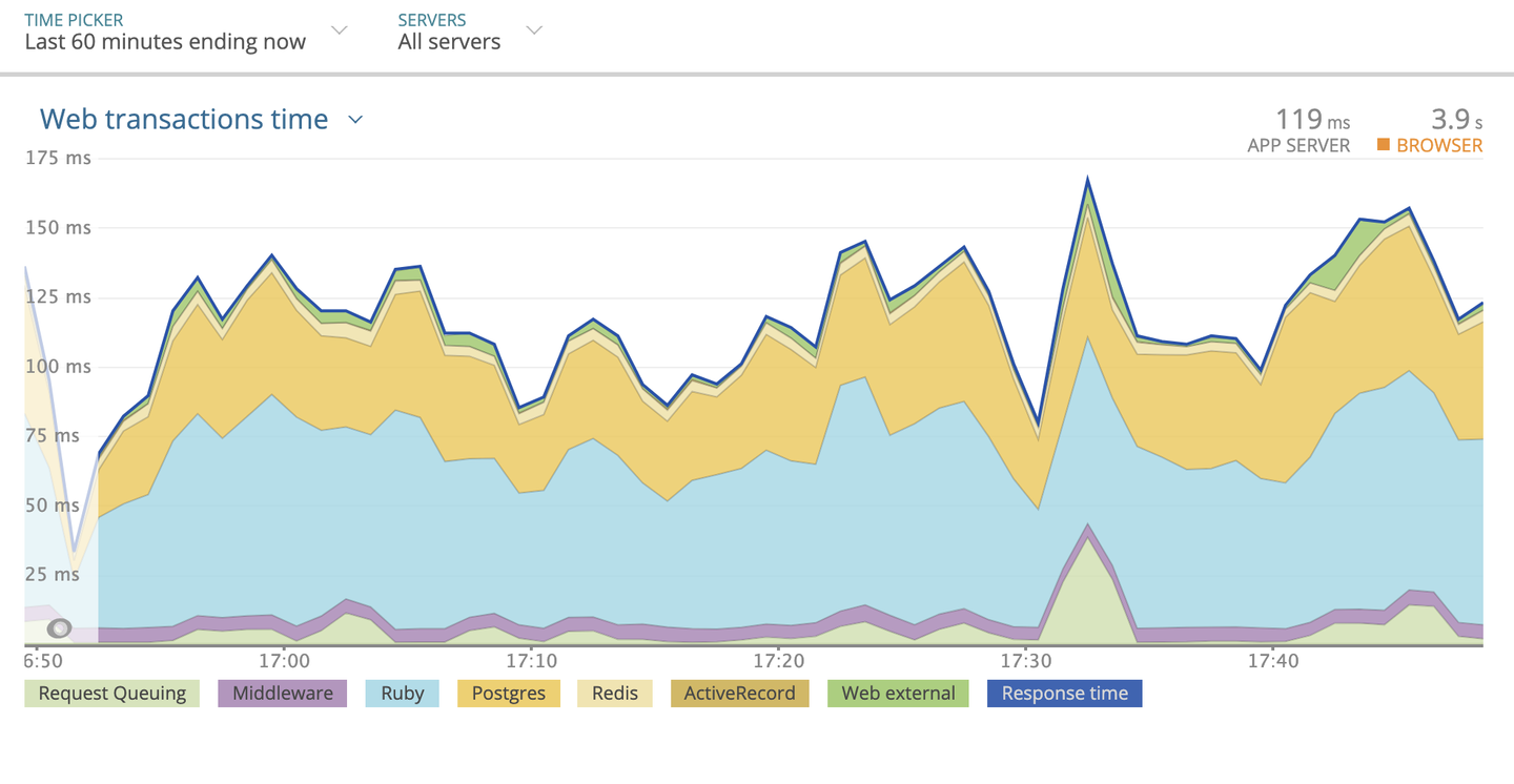 Wantedly では速度の計測に様々なサービスやツールを用いていますが、最も広く使われているものの一つに New Relic があります。New Relic では、1つのアプリケーションの中でどのような部分の処理に多くの時間を割いているのかを知ることができます。特に障害が発生したときにどこが根本の原因なのかを探るのに便利です。例えば上のグラフで Web external だけが大きくなっていたら、「依存する microservice が遅くなったことが原因かな」と予想を立てやすくなります。