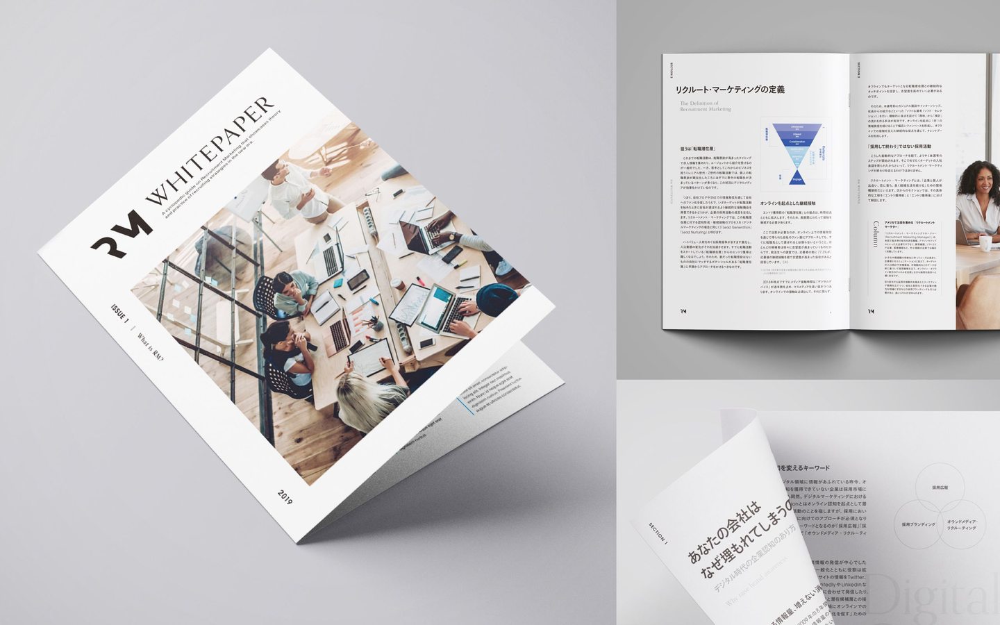 自社の提唱する採用フレームワーク「リクルートメント・マーケティング」を体系立てて説明するダウンロード用ホワイトペーパー。リッチな図版や専門家取材を通じて新しい採用理論を解説するとともに、上質感のあるエディトリアルデザインでコンテンツの信頼感を高めた。