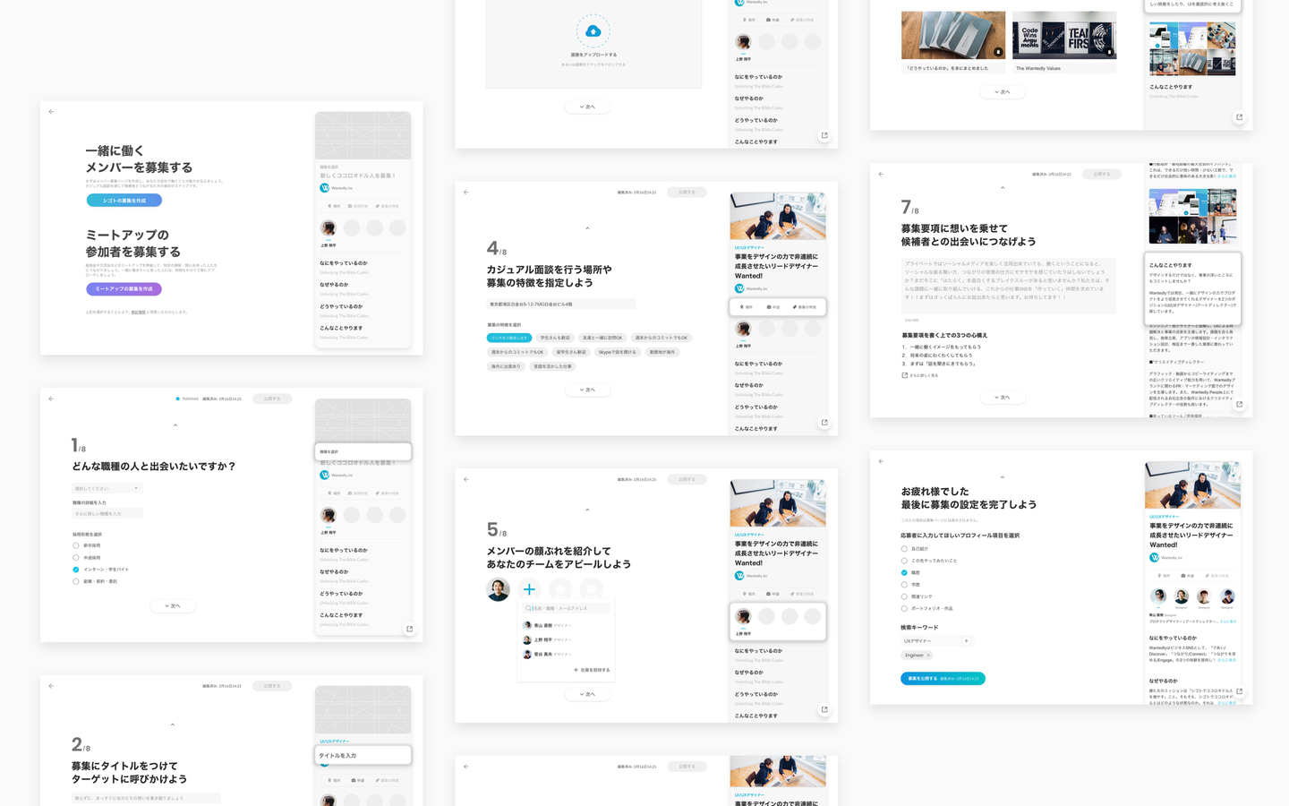 Wantedly Visit の募集作成フローをフルリニューアル。入力する内容の目的毎に画面を分割し、よりコンテンツの作成に集中しやすくなった他、リアルタイムプレビューを導入することで具体的な完成イメージを確認しながらの作成が可能となっている。