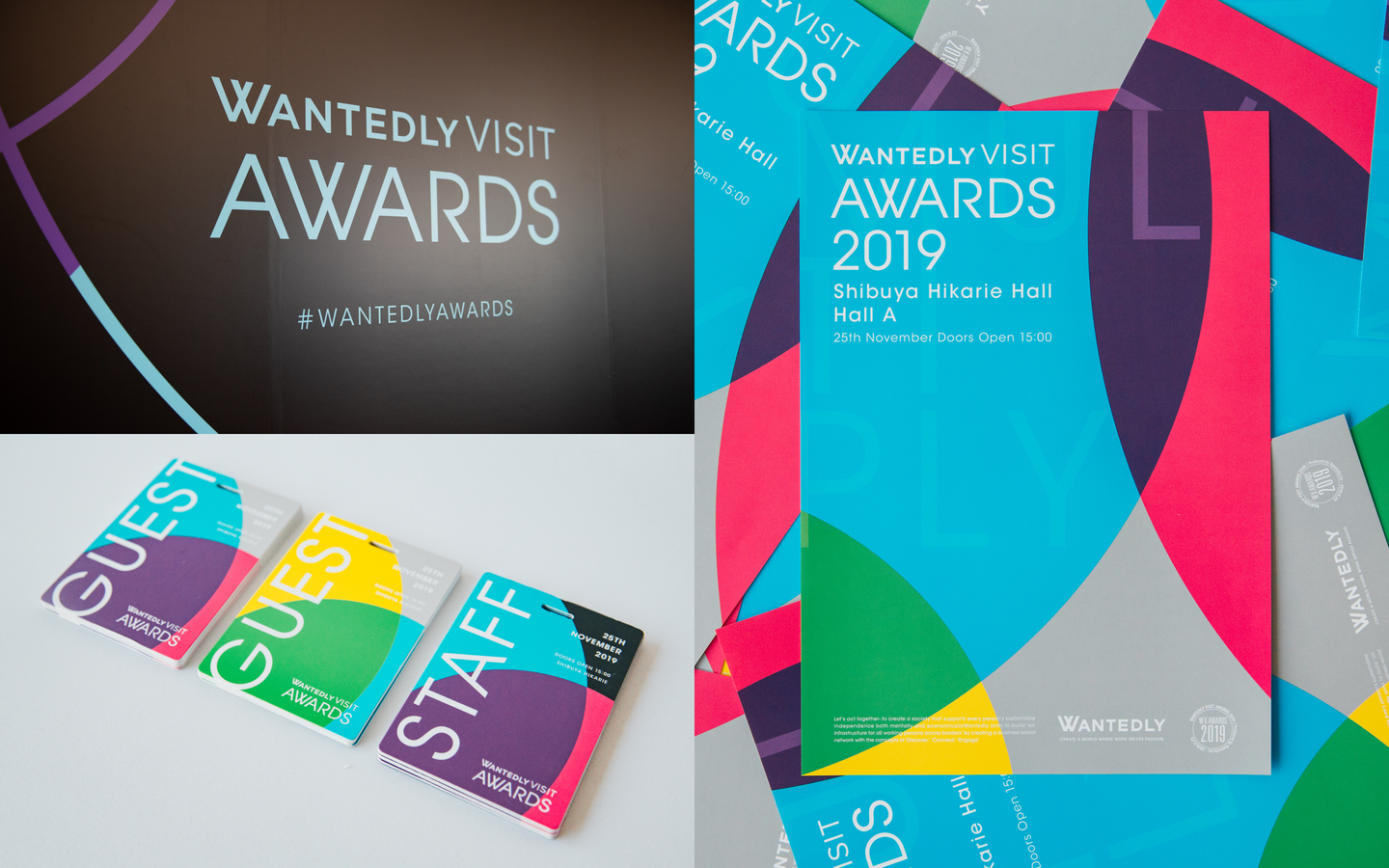 渋谷ヒカリエにて開催され、400人以上の人事担当者/経営者を集客した 『Wantedly Award 2019』 に向けて、色彩の重なり合いによるカラフルなビジュアルテーマを策定。「Multiply」をコンセプトに多様な来場者間の相乗効果を表現するとともに、渋谷への会場移転に合わせイベントイメージのトーンアップを図った。