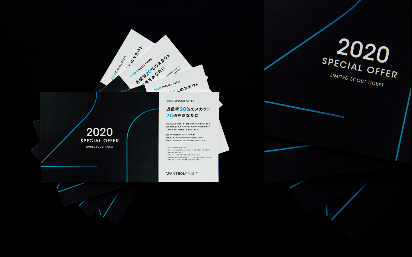 Wantedlyの販売パートナーが商談中に手渡しできる販促物として制作されたポストカード。クローズドなキャンペーンとしての特別感を演出するために、インビテーション・レターをイメージした表現になっている。
