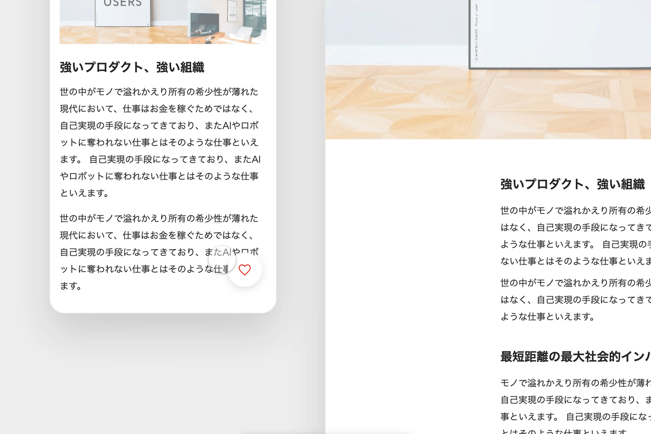 フロートボタンの役割を最重要アクションである「いいね」に限定しつつ、これまでコンテンツの可読領域を狭めていた各種シェアボタンを「いいね」を起点とするインタラクションの中に再整理することで、フィードの閲覧体験の洗練につなげた。