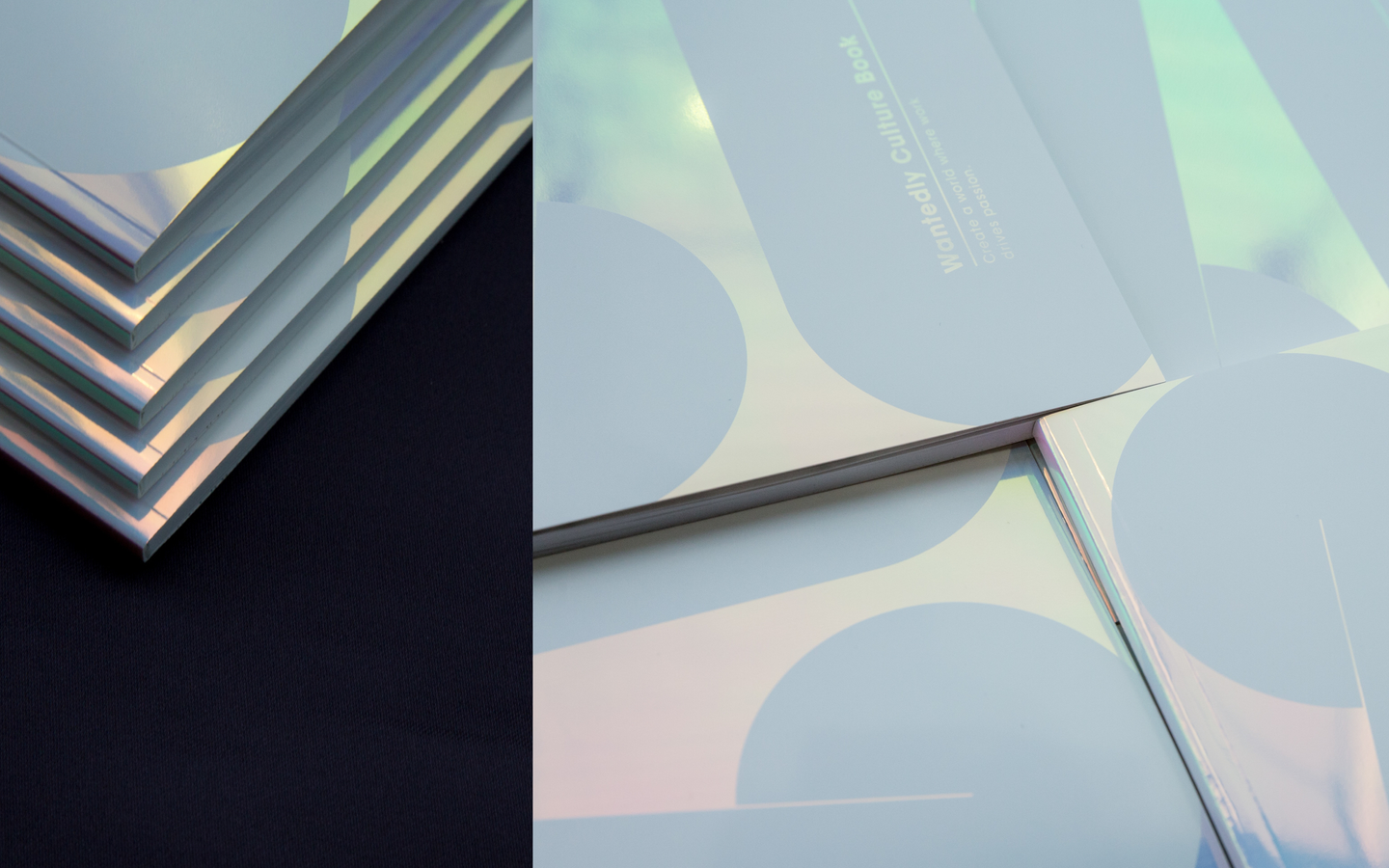 自社カルチャーを社内向けに伝える冊子の2020年度版は、昨年の「宇宙食」に続き「星雲」をイメージ。Wantedly Visitのブランドカラーである淡青とWantedly Peopleのブランドカラーである紫が視差効果を通じて交わりあう表紙デザインを通じて、2020年の社内スローガンのひとつである “One Wantedly” を表現した。