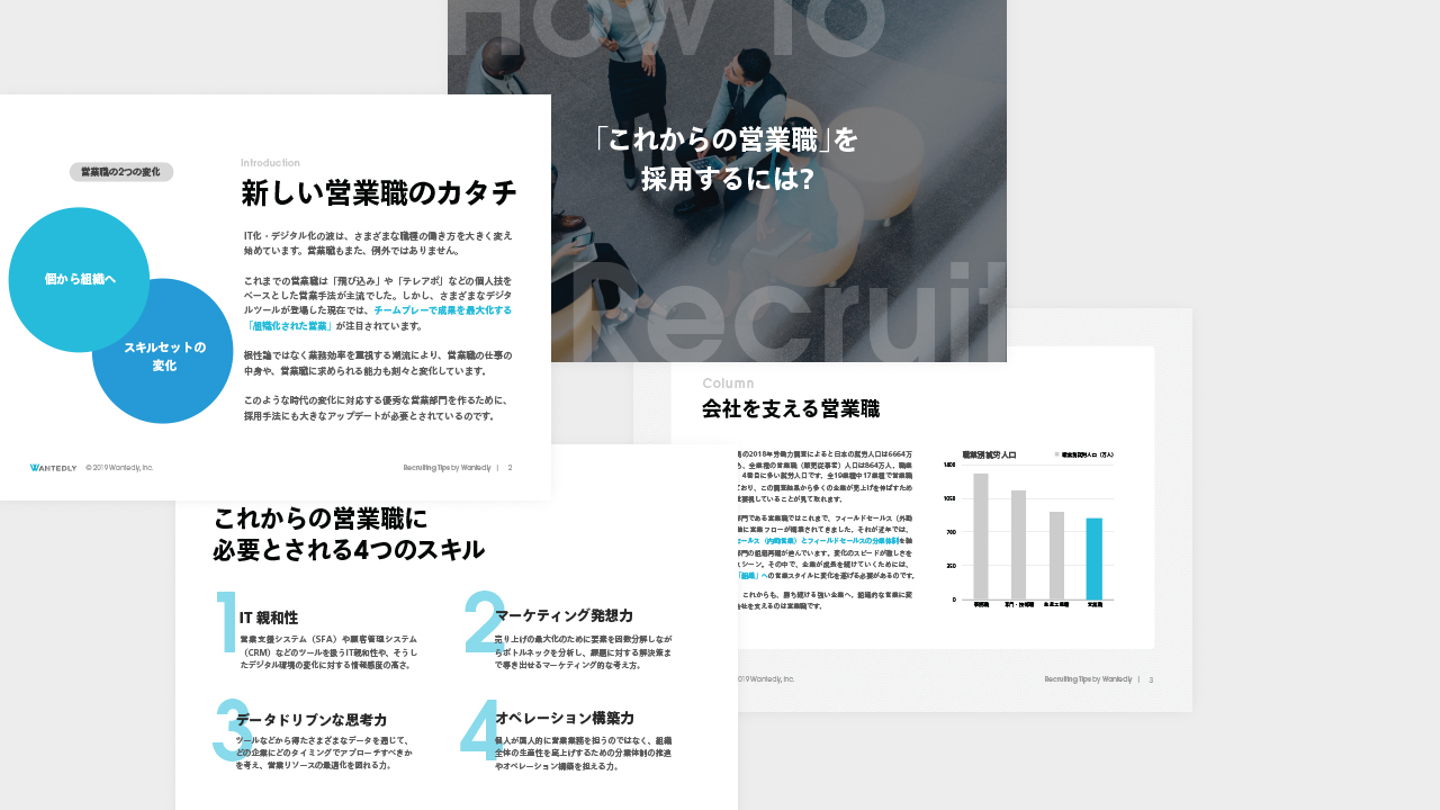 採用にまつわる個別具体的な課題をバーティカルに深掘ることで、Wantedly未認知層との初期接点づくりを目指すe-book。今後の継続的制作に向け、レイアウト上の要素定義、デザインのコンポネント化などを行った。