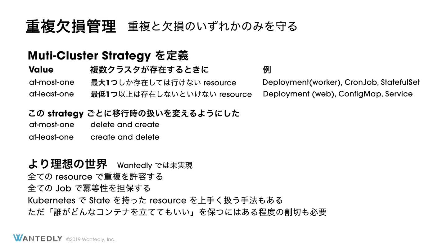 Wantedly ではすべてのリソースで 重複と欠損のどちらを守るかをラベルで明確に指定する 運用を開始しました。これによりクラスタの再作成時には、欠損が許されないものをまず最初にコピーして、重複が許されないものをコピー元から削除、最後にコピー先で再作成とすることでこの重複と欠損の問題に対応しています。この手法でスケールするのはマスター昇格のような特殊な操作を要求するリソースがクラスタ内に存在しないということが社内ルールから言えるためです。このようなフローを実現するもステートの排除は検討に値する選択肢であると考えます。