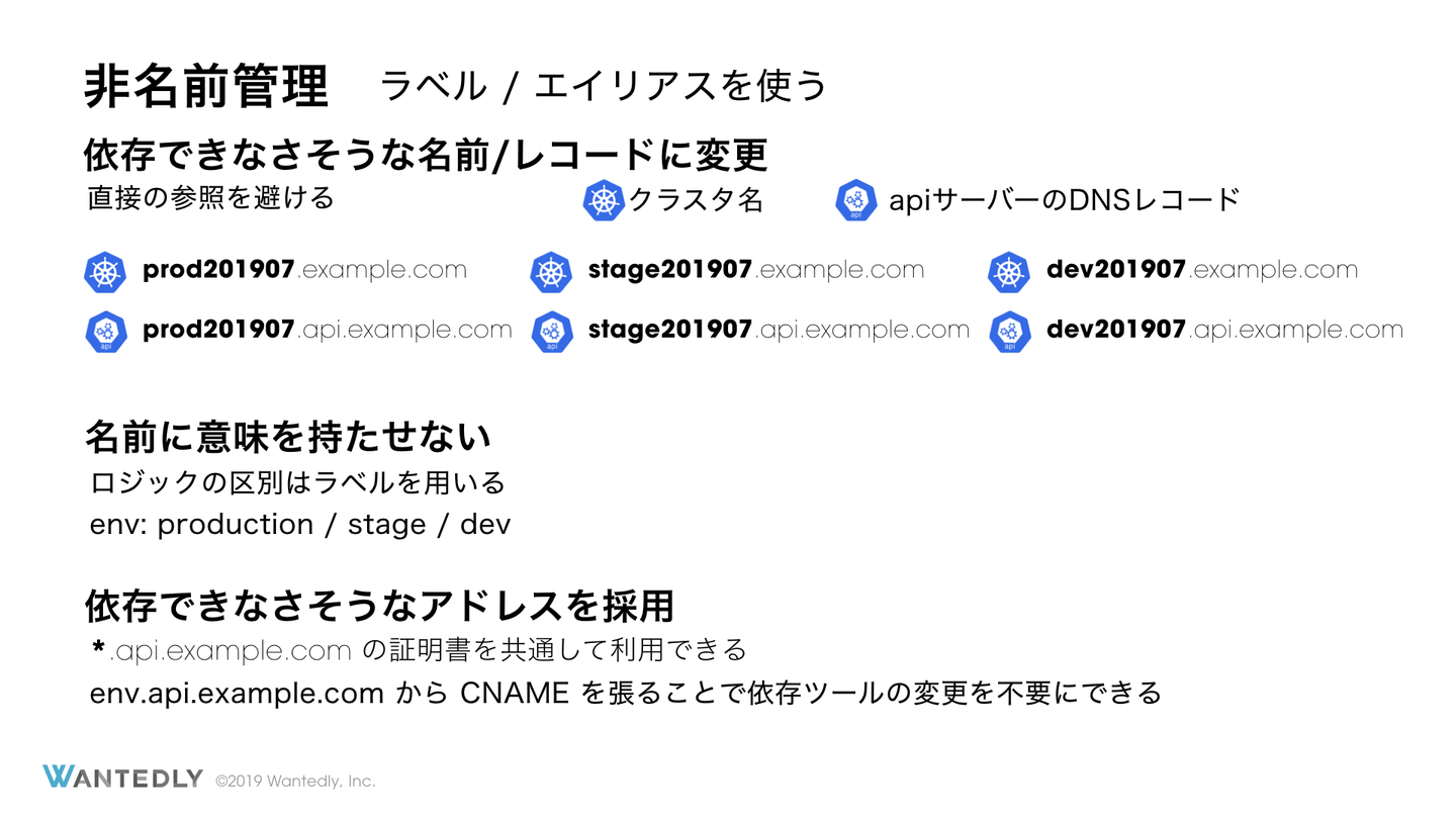 6.1 Wantedly で生じた名前管理による問題 Wantedly では production, stage, dev の3つの環境があり、それぞれで差分の小さいクラスタが運用されています。それぞれ名前は <env>.cluster.example.com, API サーバーのエンドポイントは api.<env>.cluster.example.com としていました。たとえば stage 環境では stage.cluster.example.com, api.stage.cluster.example.com などとなっています。