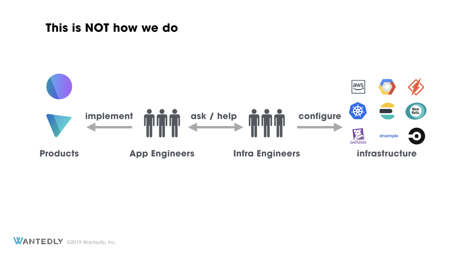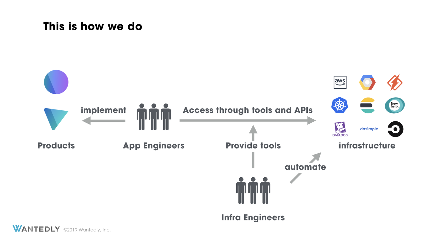 Wantedly ではインフラエンジニアとアプリケーションエンジニアの疎結合を目指しています。もちろん現時点の40人という規模では密なコミュニケーションはしばしば重要ですが、最終的にスケールしていくためにはインフラチームは基盤の作成及び運用に徹して、アプリケーションエンジニアがインフラエンジニアの存在を一切意識することなくプロダクトの開発を行えるようになるべきであるという考えを持っています。
