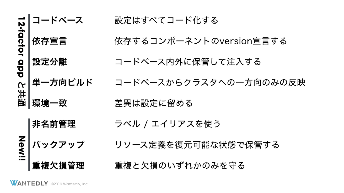 コードベース: 設定はすべてコード化する 依存宣言: 依存するコンポーネントのversionは宣言する 設定: コードベース内外に保管して注入する 単一方向ビルド: コードベース -> クラスタの一方向にする 環境一致: コードベース -> クラスタの一方向で作成して際は設定に留める 非名前管理: ラベル / エイリアスを使う バックアップ: リソース定義を復元可能な状態で保管する 重複欠損管理: 重複と欠損のいずれかのみを守る 最初の5つは 12 Factor App と共通のエッセンスをもつもので 12 Factor App を大いに参考にしました。最後の3つはインフラ特有のもので新たに考案したものです。それでは実際に各項目の内容を詳しく説明していきます。