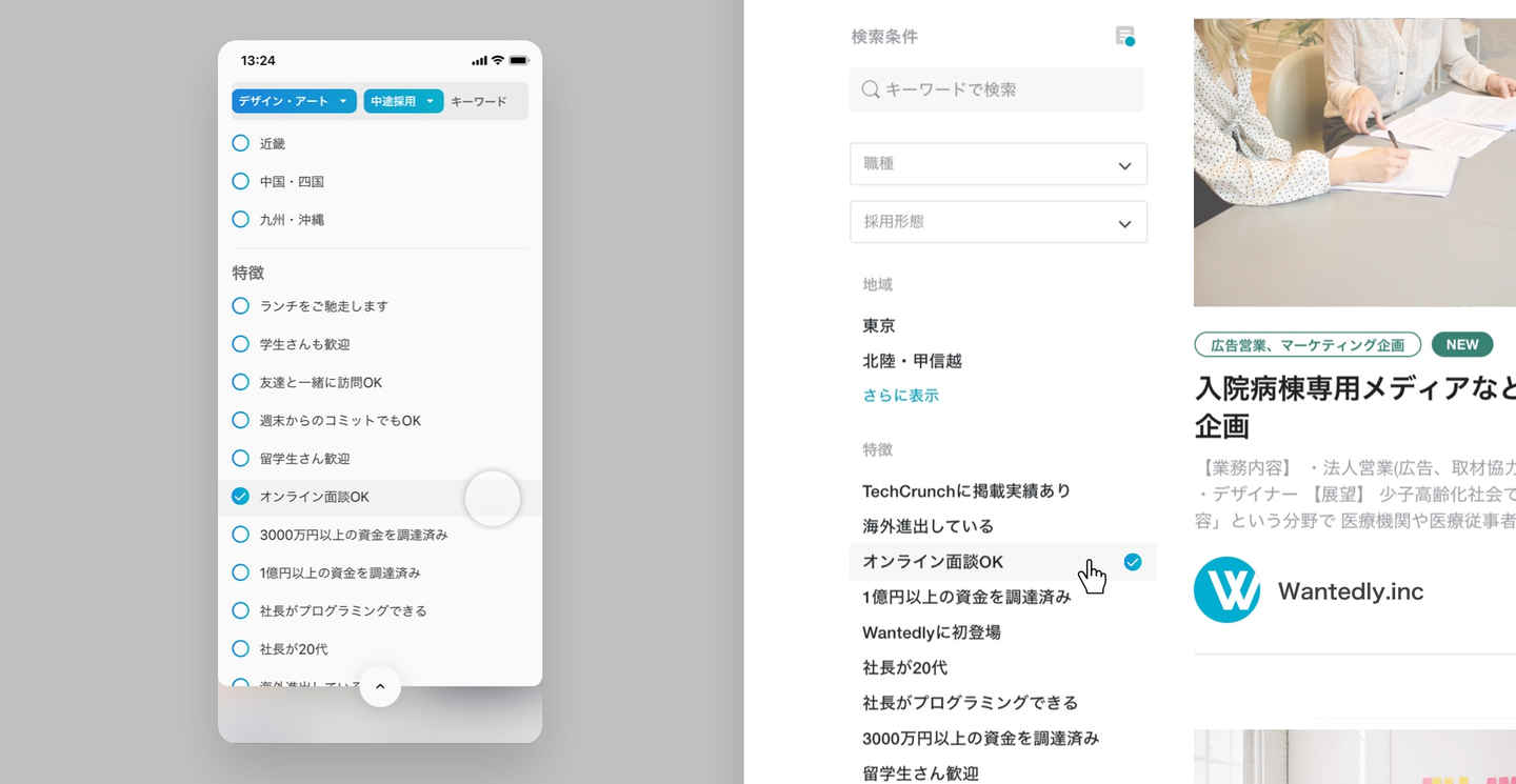 検索条件にて「オンライン面談」OKのチェックボックスを活用することで、オンライン面談OKな募集に絞ることが出来ます。