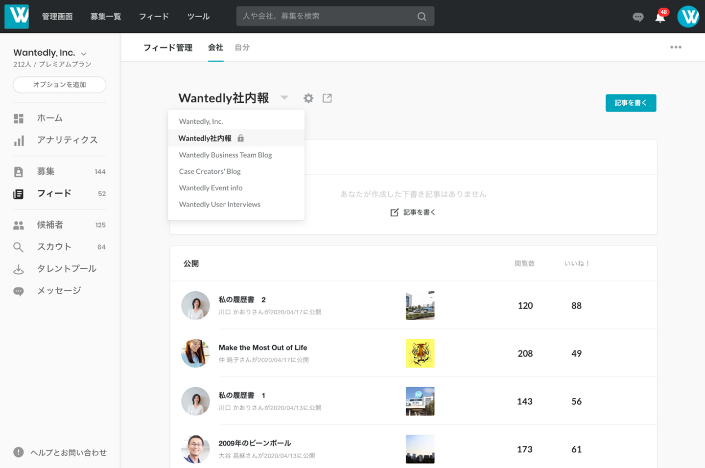 これまで記事投稿機能「Feed」は会社のメンバーや会社のストーリーを作り、外部へ発信することに特化してきました。今回Feed機能を強化してリリースした社内報機能α版では、自社のメンバー限定で記事を配信し、ストーリーを伝えることができます。社内報機能α版は利用申込みをいただいた Wantedly の有料プランご利用企業様へ無償にて提供いたします。