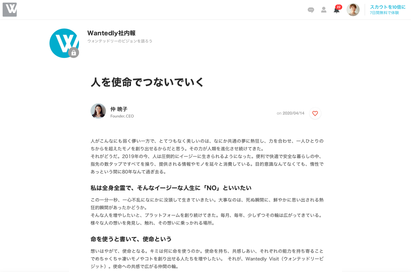 ウォンテッドリーは、対面でコミュニケーションしづらい環境においても、会社のビジョンやバリュー浸透を促進させるために、福利厚生サービス「Perk」を皮切りに開始したエンゲージメント事業の第二弾として、Wantedly有料プラン利用企業が自社のメンバーに限定して記事を公開できる、社内報機能α版を無償提供開始しました。