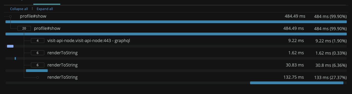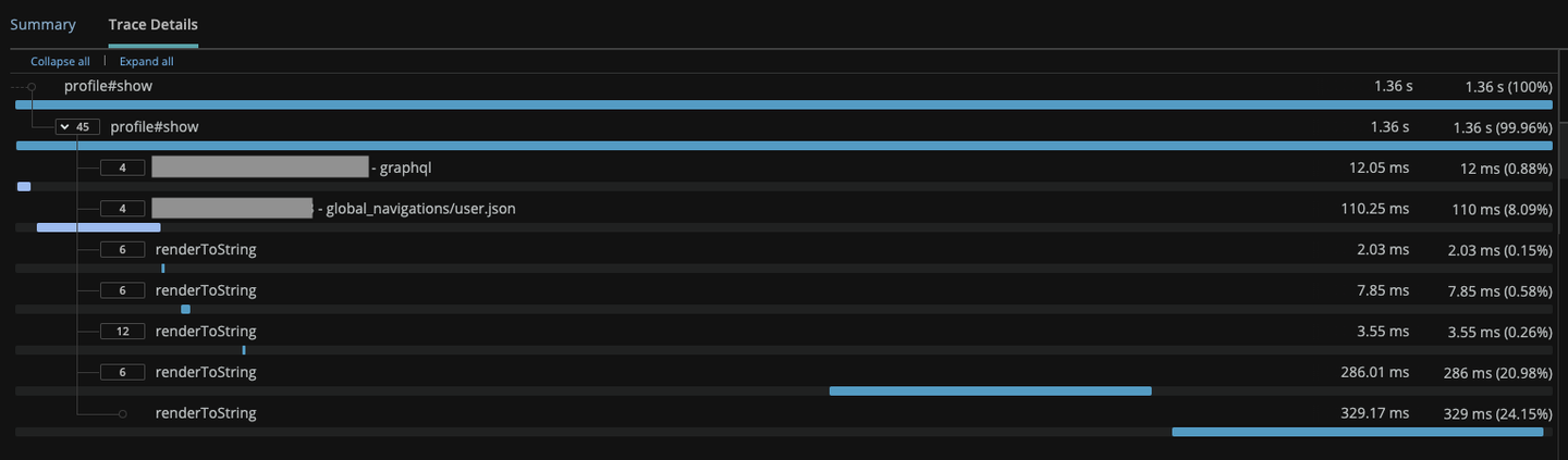 }); これで、全体の中で renderToString にどれくらいの時間を使っているかが可視化できるはずです。このコードをデプロイした後に New Relic で Transaction detail を見てみるとこんな感じでした。